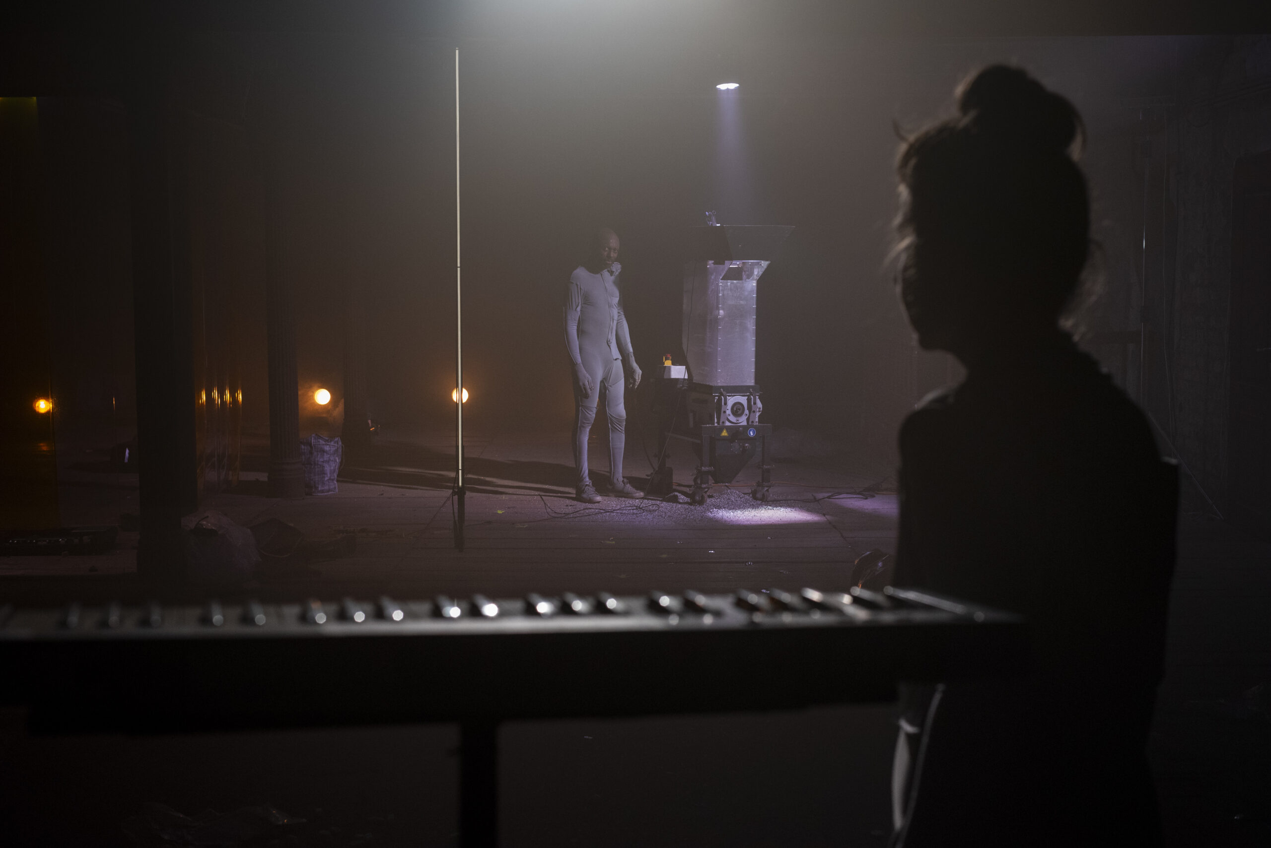 Was geschieht mit dem Überflüssigen, den Überbleibseln und Altlasten, dem Unerwünschten, dem Abfall, dem Rest? Eine Pianistin (Clara Frühstück) und ein Performer und Stepptänzer (Mani Obeya) treffen auf einen Industrieshredder. Der performative Bühnenraum (Samuel Schaab) bringt einen Prozess in Gang, der Klangmuster auflöst und alles erfasst, was sich ihm in den Weg stellt. Mit vollem Körpereinsatz gilt es, eine endlose Materialflut zu zerkleinern, zu zermalmen, zu zermahlen. Clara Frühstück tauscht den Flügel gegen eine von Schaab gebaute Keyboard-Skulptur, die von Sixtus Preiss (Sounddesign) mit Klavier-Fragmenten und Piano-Pulver befüllt wurde. Der von Ferdinand Schmalz eigens für den Abend entwickelte Text wirbelt in flirrenden Pigmenten durch den Raum und setzt sich ab: als Teil einer Komposition für Kunststoffreste, Klangpartikel, ein Dutzend Plastikkeyboards, Sand, Sprachreste, Staub.